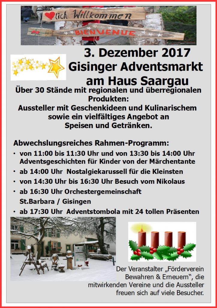 Am Sonntag, 03. Dezember 2017 findet der mittlerweile schon traditionelle Gisinger Adventsmarkt rund um das Haus Saargau statt. Von 10 bis […]