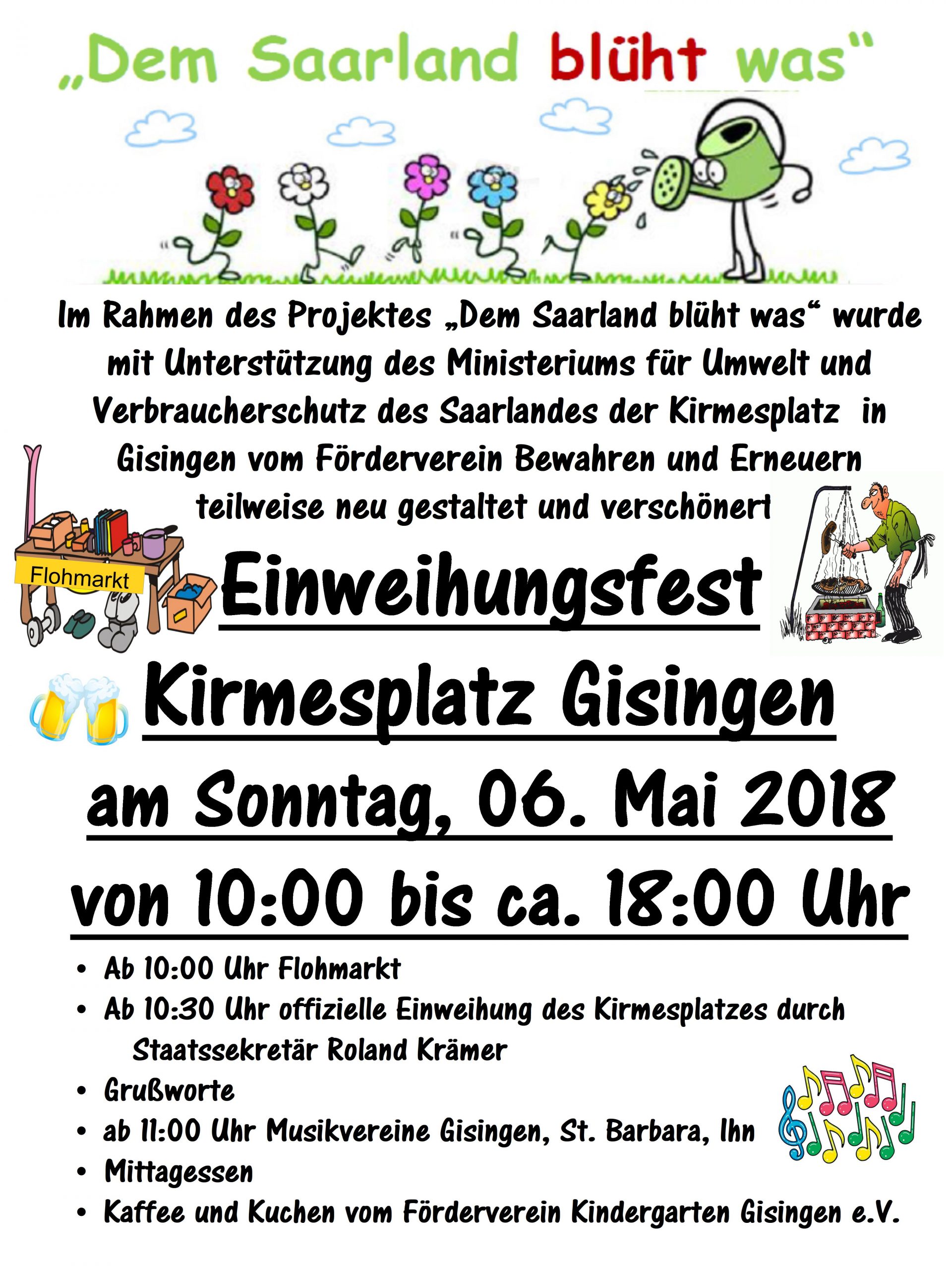 mit Mitteln des Ministeriums für Umwelt und Verbraucherschutz des Saarlandes einen Teil des Kirmesplatzes in Gisingen neu gestaltet und verschönert. Nachdem nun alle Arbeiten abgeschlossen werden konnten, wird der Kirmesplatz am Sonntag, 06. Mai 2018 mit einem Fest eingeweiht. Ab 10:30 Uhr wird Herr Staatssekretär Roland Krämer den neu gestalteten Platz einweihen und übergeben. Nach weiteren Grußworten werden die Musikvereine Gisingen, St. Barbara und Ihn die Gäste ab ca 11:00 Uhr musikalisch unterhalten. Für das leibliche Wohl wird vom Förderverein natürlich mit den verschiedensten Speisen und Getränken Sorge getragen; der neu gegründete Förderverein des Kindergartens Gisingen wird mit Kaffee und Kuchen ebenfalls für Gaumenfreuden sorgen.