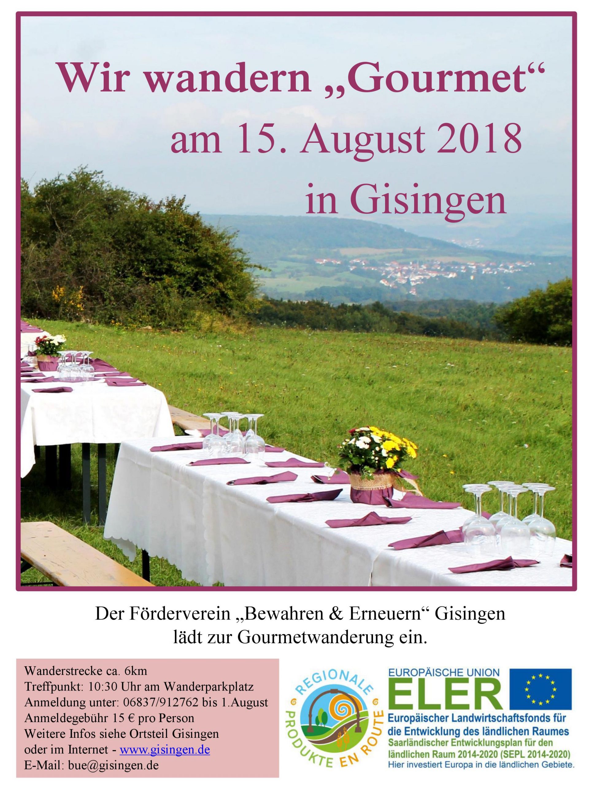 Der Förderverein Bewahren und Erneuern Gisingen lädt im Rahmen des von der EU geförderten Leader Projektes „Regionale Produkte en route“ am 15. August 2018 zu einer Gourmetwanderung
