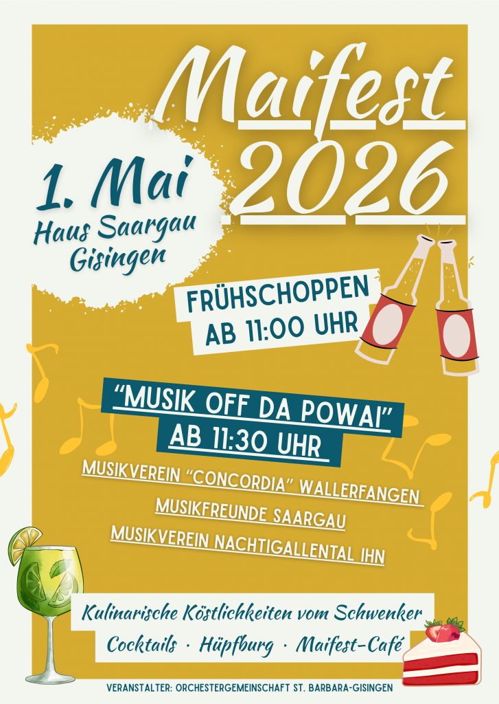 Auch in diesem Jahr veranstalten die Musikvereine Gisingen und St.Barbara wieder das beliebte traditionelle Maifest am Haus Saargau in Gisingen. Am Freitag, den 01.05.2026, laden wir zwischen 11 und 19 Uhr zu Essen und Trinken, Kaffee und Kuchen und zum Verweilen ein.