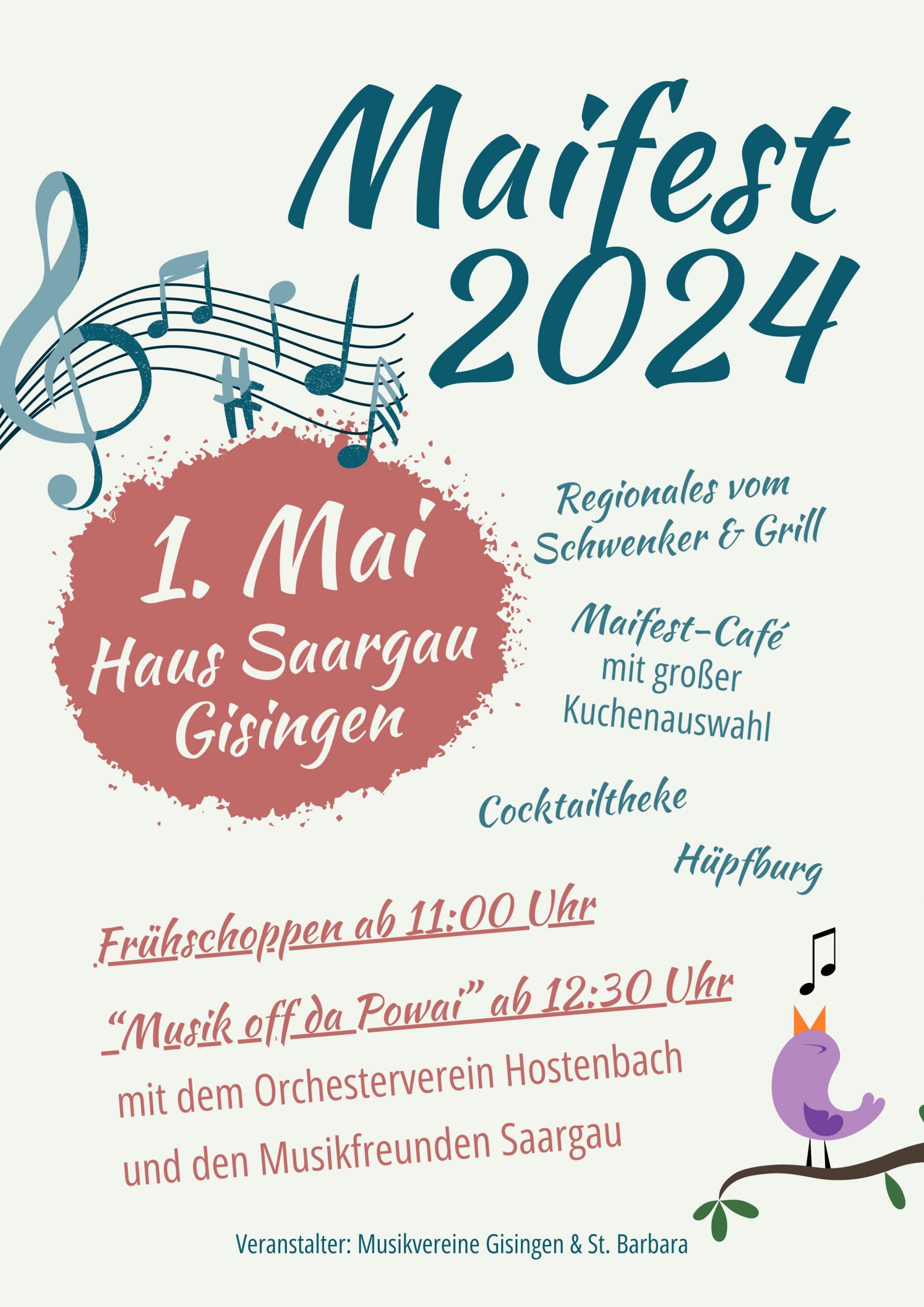 Auch in diesem Jahr veranstalten die Musikvereine Gisingen und St.Barbara wieder das beliebte traditionelle Maifest am Haus Saargau in Gisingen. Am Mittwoch, 01.05.2024, dem Tag der Arbeit, laden die Musikvereine zwischen 11 und 19 Uhr zu Essen und Trinken sowie Kaffee und Kuchen und zum Verweilen ein. Ab der Mittagszeit (ab 12:30 Uhr) unterhalten unsere Freunde, der Orchesterverein Hostenbach und die Musikfreunde Saargau zudem mit Blasmusik die Gäste.